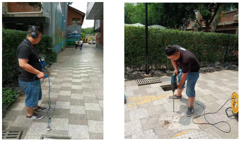 到達區域,采用聽漏儀進行地面聽音,對相關儀的定位結果進行進一步核實,確認漏點,并采用電錘鉆鉆孔最終核實點位是否有漏水。見圖4