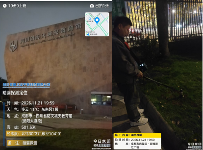 2025年11月21日,位于四川省成都市的四川省防災減災教育館是一家事業單位,單位消防管道都是架空管,地下管道采用球磨鑄鐵管。單位有過漏水的經歷,當發現水表讀數異常后,還是習慣性認為原先漏水區域的管道又漏水了,查找二天均無結果。四川觸點科技接到漏水檢測任務信息后,安排專人到達現場查勘,制定出先采用加壓示蹤氣體探測鎖定漏水區域,再結合聽漏儀定位的技術方案,成功檢測出地下暗漏水點位一處。