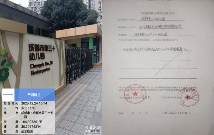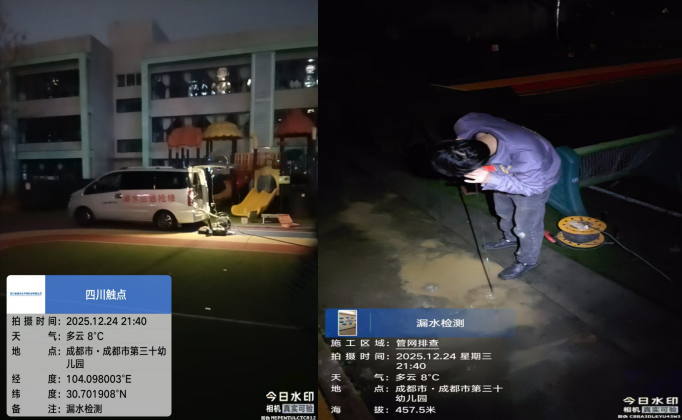 隨著國家水利部對于節(jié)水產(chǎn)業(yè)的重視和支持,節(jié)水行業(yè)蓬勃發(fā)展,各用水單位也越來越重視節(jié)水降能工作,全國各地節(jié)水企業(yè)和漏水維修檢測公司也雨后春筍辦紛紛成立,技術(shù)殘差不齊。四川觸點科技作為立足成都市轄區(qū)和輻射川渝地區(qū)的專業(yè)節(jié)水維修探漏公司,充分利用先進(jìn)專業(yè)探測技術(shù)和經(jīng)驗,根據(jù)用戶需求積極響應(yīng)到場時間,做到了客戶放下電話后2小時到達(dá)現(xiàn)場進(jìn)行地下隱蔽管道漏水檢測定位,積極幫助用水戶解決地面沉降、地面不明水、井室內(nèi)不明水、室內(nèi)墻壁起泡發(fā)霉、地下車庫墻壁房梁漏水滴水、當(dāng)月水費急增、消防管道失壓、消防水表泵房儲水池不明水增加、地下排水管泄漏和堵塞、內(nèi)窺鏡檢查等困難。例如:2025年12月24日,成都市第三十幼兒園反饋問題:“操場出現(xiàn)不明水,但地面無沉降和各用水設(shè)施都是完好無損,需要我司根據(jù)幼兒園放學(xué)后進(jìn)場檢測,并延期到周六周日開挖修復(fù)完畢”。我司技術(shù)人員到達(dá)現(xiàn)場后,先采取觀察一級水表讀數(shù)和檢查排水管完好情況,判定出屬于給水管道泄漏造成。然后,采用相關(guān)儀對可疑管道進(jìn)行調(diào)查分析,結(jié)合示蹤氣體探測確定大致區(qū)域后,用電子聽漏儀進(jìn)行精準(zhǔn)定位,最后鉆眼確認(rèn)的完整工序,成功檢測出漏水管位置,為周末修理管道打下堅實基礎(chǔ)。